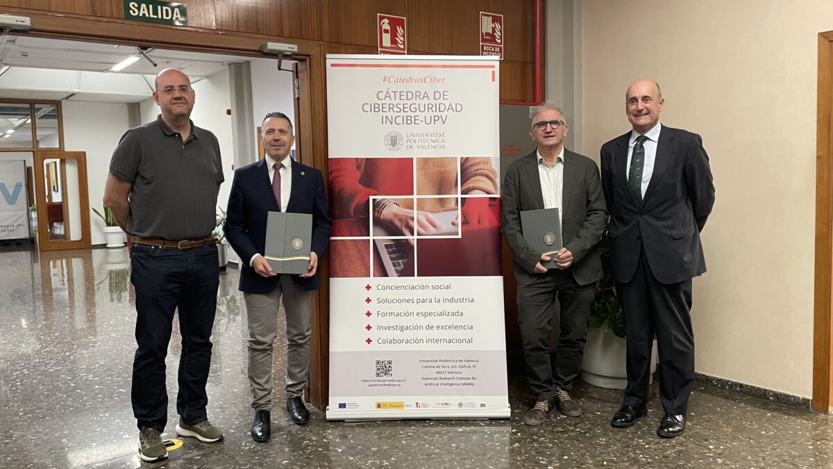 La firma de este acuerdo se ha realizado en el edificio de rectorado de la UPV. Y en ella, han estado presentes el rector de la Universitat Politècnica de València, José E. Capilla, el director de la Cátedra de Ciberseguridad INCIBE-UPV e investigador de VRAIN de la UPV, Santiago Escobar, el director del Parc Científic de la Universitat de València, Pedro Carrasco, y el gerente de la Fundació Parc Científic Universitat de València, Fernando Mª. Zárraga.