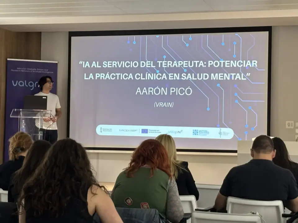 16/10/2025Published by prensa on 16/10/2025Categories NewsEl investigador de VRAIN, Aarón Picó, destaca en una jornada la alianza entre inteligencia artificial y salud mentalLa jornada, impulsada por ValgrAI y celebrada en el Colegio de Médicos de Valencia, ha mostrado aplicaciones de la IA en diagnóstico médico, neurorehabilitación, imagen biomédica, salud mental y protección de datos